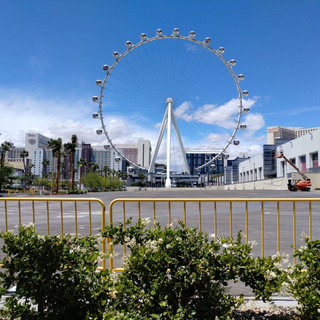 We hike up Tropicana toward the Strip. We head north and take a little side street with the aroma of smoked meat and popcorn. Happy people laugh. People gawk. I walk toward the big Ferris wheel and learn it's actually not a ride but a slowly-rotating observation wheel.