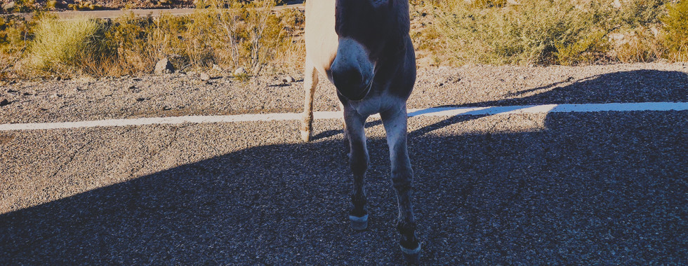 Wednesday morning, I drive through the old mining town of Oatman on my way to Kingman. Oatman is now a tourist destination along Historic Route 66. Others come to Oatman to visit the donkeys that wander about town. The donkeys are not unique to this town; rather, the wild donkeys are regional the way some regions might be prone to big horn sheep or black squirrels. But, the people here feed the donkeys, so a particular group of donkeys hang around the town. As I pass through the old mining town, I see a lady feeding the donkeys. One of them climbs up onto the walkway to get closer.